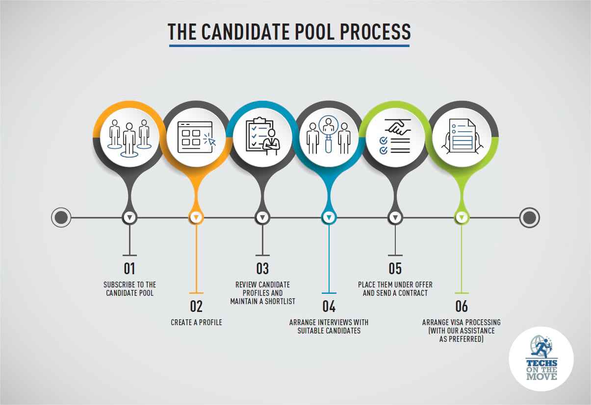 • There are no big recruitment fees or on-going guarantees, as we are not recruiters. Once a client subscribes to the Candidate Pool on a 12 month basis, there are no limits to how many candidates are contacted or hired through the Pool. This service means our clients can review a sampling of qualified and migration-ready candidates for an investment similar to using popular domestic candidate seeking platforms.