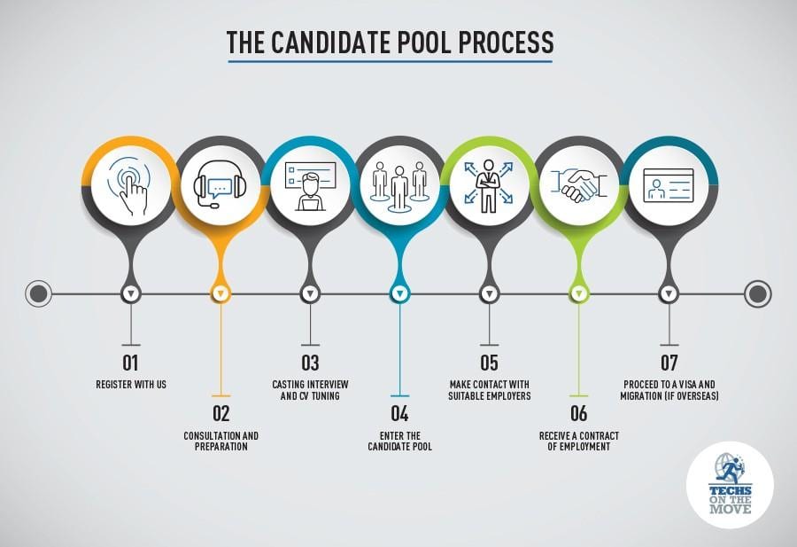 The infographic above demonstrates this Pool from the employer’s perspective. We only work with the country’s premier employers and automotive groups, who subscribe to our Candidate Pool so they can be in touch with experienced and skilled technicians and tradespeople from abroad. They can then be in touch with our candidates as they please, giving you the broadest possible options when considering a move Down Under.